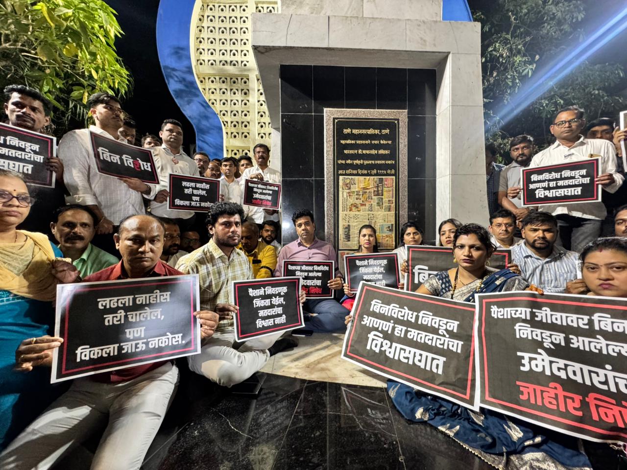 ठाणे: कपटनितीने आणि पैशांचा खेळ करून शिवसेना शिंदे गटाने सात उमेदवार बिनविरोध निवडून आणले. हे कृत्य लोकशाहीविरोधी असून मतदारांची घोर फसवणुक आहे, असा आरोप करीत मनसे नेते अविनाश जाधव यांच्या नेतृत्वाखाली शुक्रवारी भारतरत्न डॉ. बाबासाहेब आंबेडकर यांच्या पुतळ्याजवळ मनसेने काळ्या फिती लावुन निषेध केला.
