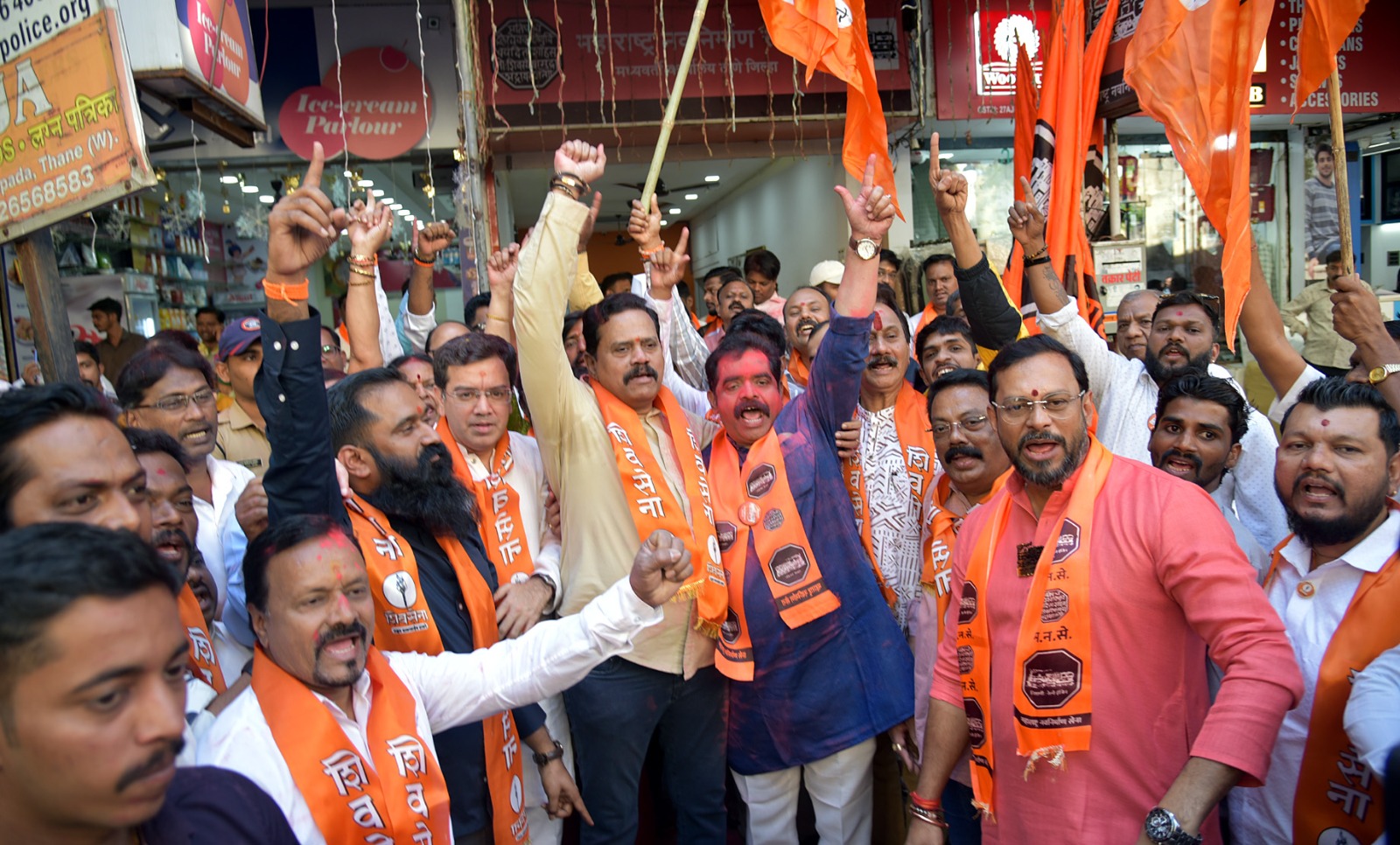 मनसेचे ठाणे-पालघर जिल्हाध्यक्ष अविनाश जाधव यांच्या मार्गदर्शनाखाली मनसे शहर अध्यक्ष रविंद्र मोरे, महिला शहर प्रमुख समिक्षा मार्कंडे यांच्या नेतृत्वाखाली नौपाडा, विष्णुनगर येथील मनसे मुख्यालयासमोर गुलाल उधळुन फटाके फोडत जल्लोष करण्यात आला. या जल्लोषात शिवसेना (उद्धव बाळासाहेब ठाकरे) पक्षाचे नेते माजी खासदार राजन विचारे, जिल्हाप्रमुख केदार दिघे हे देखील सहभागी झाले होते.